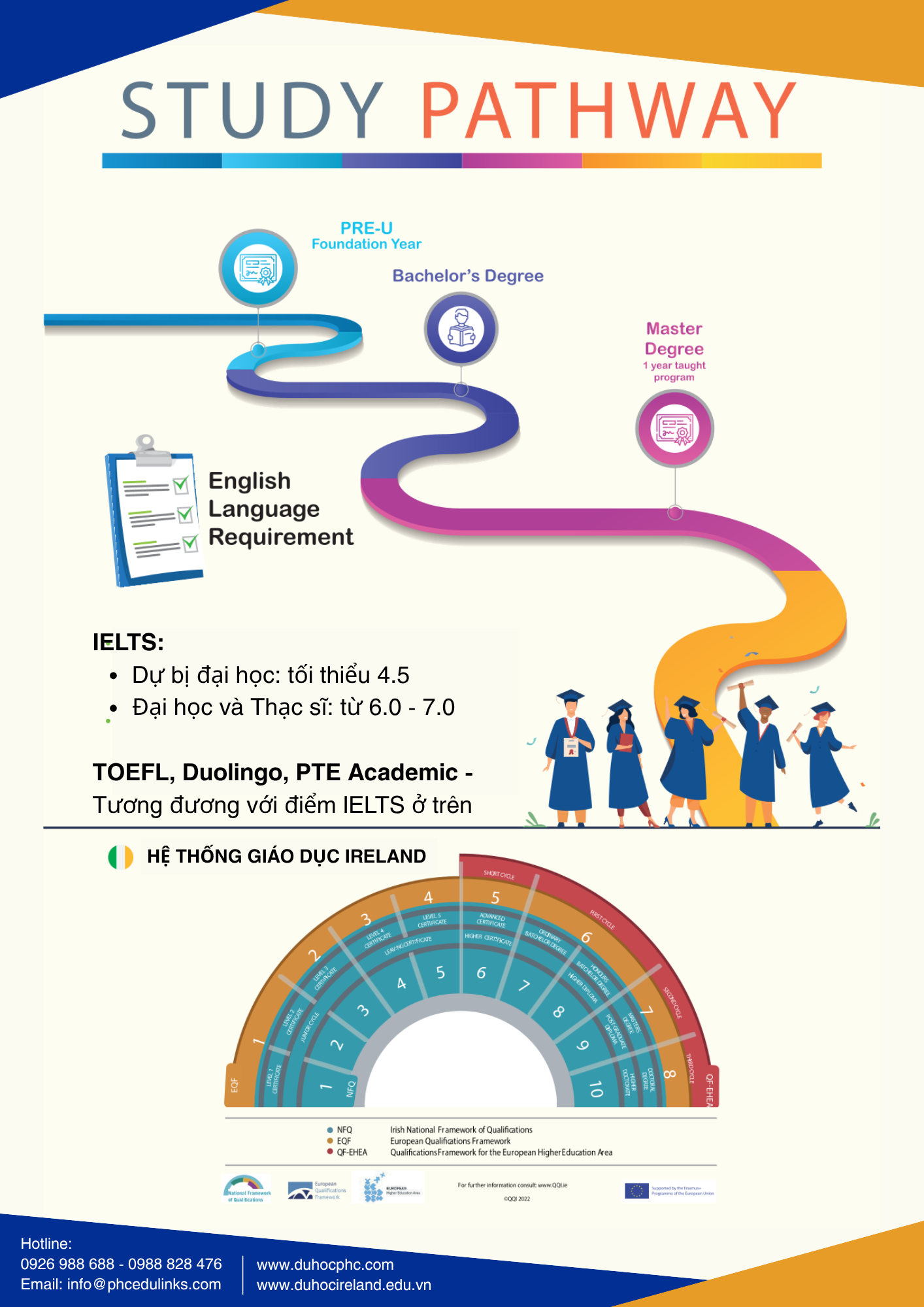 Từ Foundation đến Master, Ireland mang đến một hành trình học tập rõ ràng – linh hoạt – đầy cơ hội cho sinh viên quốc tế. Với bằng cấp chuẩn EU, cơ hội làm việc sau tốt nghiệp và chính sách định cư cởi mở, Ireland chính là điểm đến đáng đầu tư cho tương lai của bạn. Lên ngay lộ trình du học Ireland cùng PHC nào để được các chuyên gia của PHC hỗ trợ và thiết kế lộ trình du học phù hợp cho từng hồ sơ và mong muốn của các phụ huynh và các em học sinh/sinh viên.